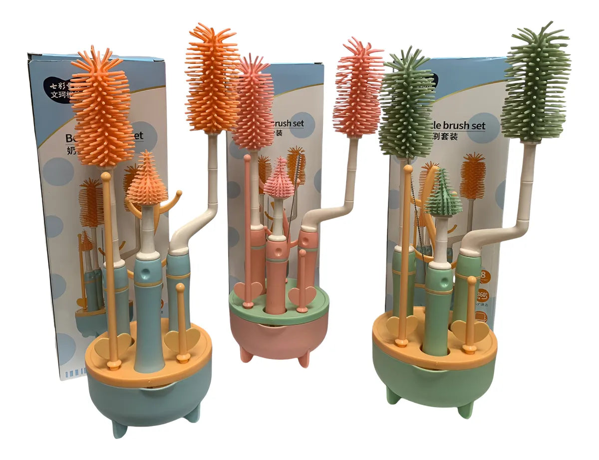 Set completo 6 en 1: incluye cepillo grande, cepillo curvo, mini cepillo para pezones, limpiador de pajillas y base organizadora.
